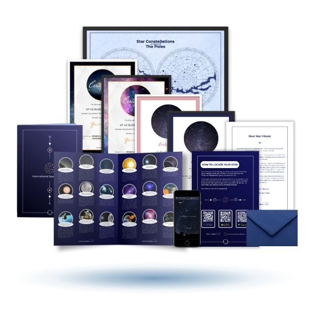 The foundation of the All-In-One Premium Gift Set is our Complete Star Naming Gift Set, which includes: a premium presentation folder, a star location guide, an official confirmation letter, an informative mini magazine, a stunning XXL star map poster, and a personalized greeting card. Everything you need to make your star dedication truly special.