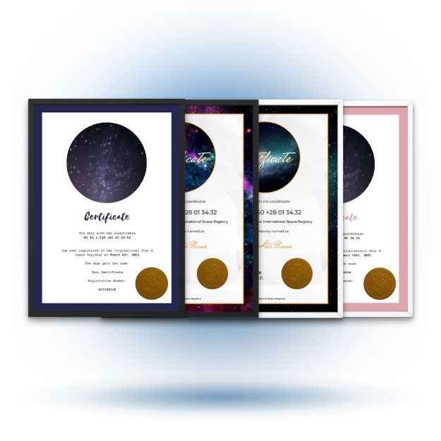 The All-In-One Premium Gift Set includes a personalized certificate featuring all key details of your star: its name, coordinates, and dedication date. Printed on high-quality paper and elegantly framed in a premium wooden frame (available in white or black), this certificate becomes a timeless keepsake—perfect for gifting or display.