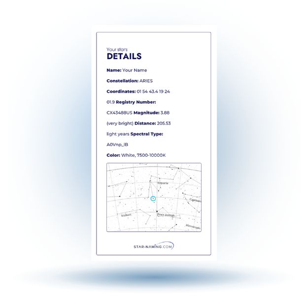 The All-In-One Premium Gift Set includes a personalized star map created specifically for your star. It displays the exact location of your star within the chosen constellation, making it easy to find in the night sky. Printed on high-quality paper, this unique chart is a meaningful keepsake that enhances your star-naming experience.